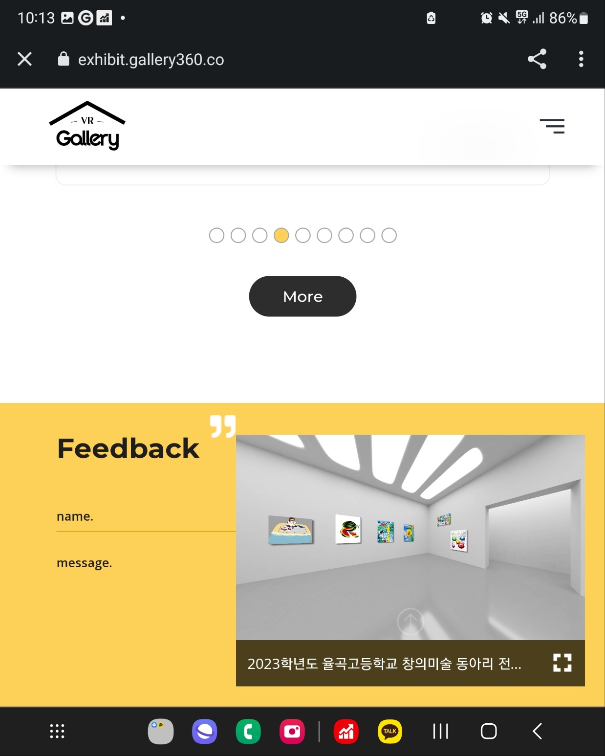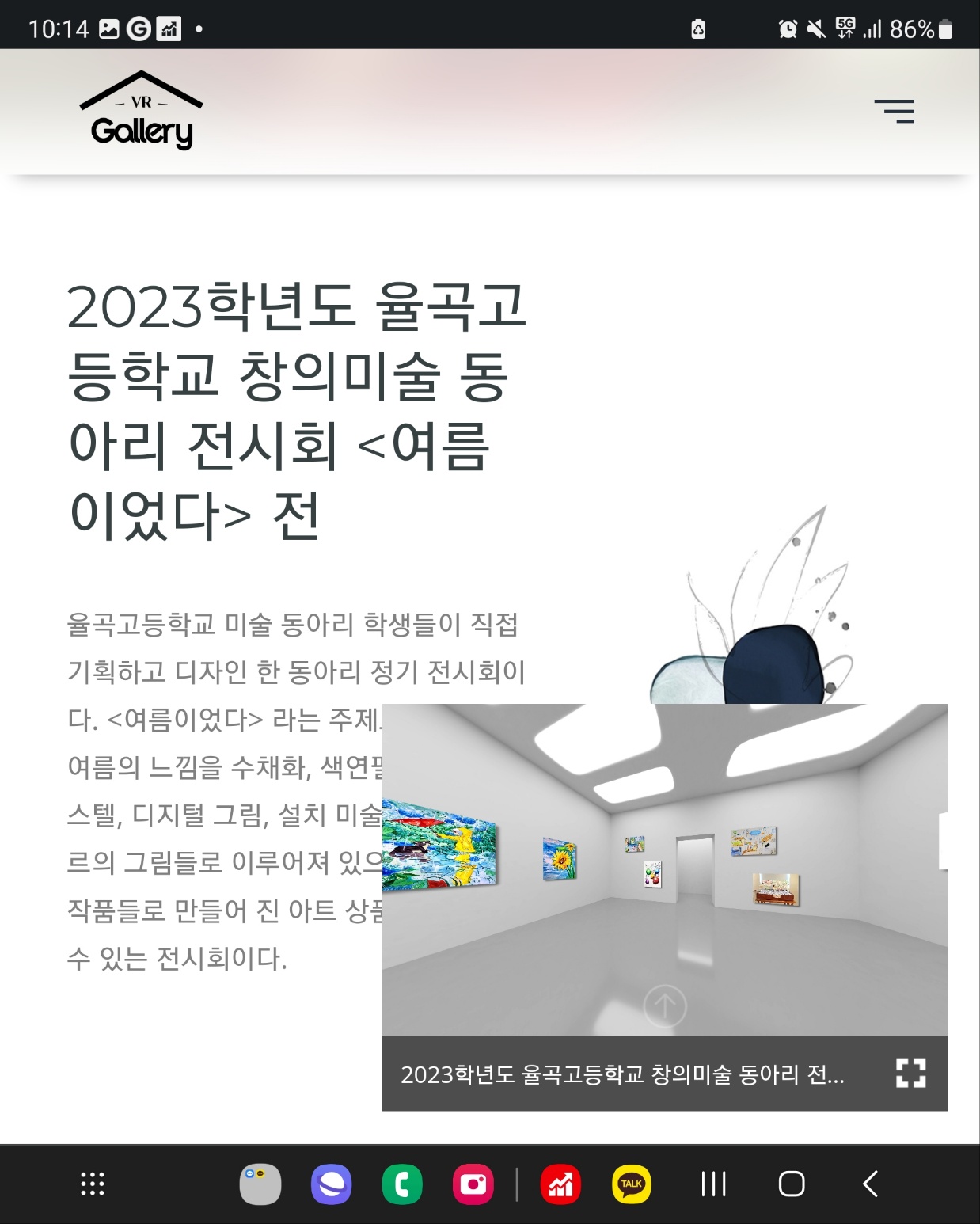 360 갤러리에서 30일 동안 가상 갤러리도 운영했습니다. 한 달 15만원 정도이구요. 가상 갤러리 구성 후 링크를 전교생 및 학부모 교직원에게 단체 메세지로 보내서 꼭 갤러리에 오지 않아도 학교 구성원 모두가 전시회를 즐길 수 있도록 했어요.
